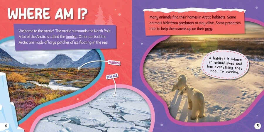 It's time to play eye spy—in the Arctic! This book invites readers to find cleverly camouflaged animals in the snowy white of the Arctic habitat. From polar bears to seals, the animals of Arctic are endlessly fascinating, as are the adaptations they have to survive in such an extreme environment. Readers learn about how these animals hide, survive, and the main characteristics of the Arctic habitat in the pages of this book. Written with new readers in mind, the text is accessible and supported by full-color, close-up photographs. Can you spot the animal in them?